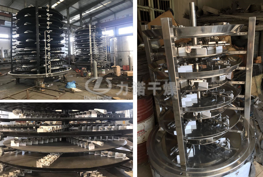 湿物料自加料器连续地加到干燥器上部第一层干燥盘上,带有耙叶的耙臂作回转运动使耙臂作回转运动使耙叶连续地翻抄物料。物料沿指数螺旋线流过干燥盘表面,在小干燥盘上的物料被移送到外缘,并在外缘落到下方的大干燥盘外缘,在大干盘上物料向里移动并从中间落料口落如下一层小干燥盘中。大小干燥盘上下交替排列,物料得以连续地流过整个干燥器。中空的干燥盘内通入加热介质,加热介质形式有饱和蒸汽、热水和导热油,加热介质由干燥盘的一端进入,从另一端导出。已干物料从最后一层干燥盘落到壳体