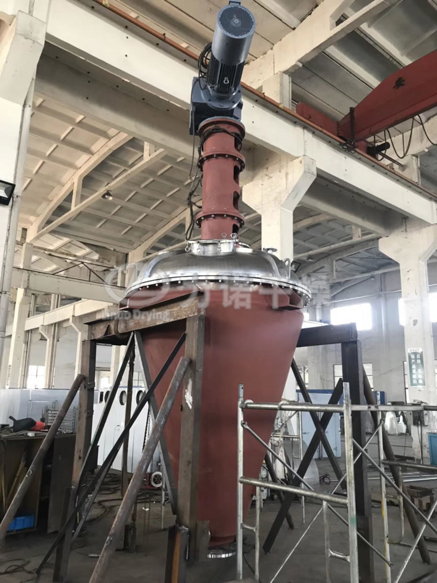 内加热螺带锥形真空干燥机是一种利用螺带将物料旋转提升及圆锥夹套、空心螺带内同时通入传热介质(如热水、导热油、蒸汽等),使加热后物料从四周提升并从中间下落,快速不断的循环翻转,并通过筒体内抽真空将水汽及时带走, 使物料在短时间内达到干燥和混合目的。